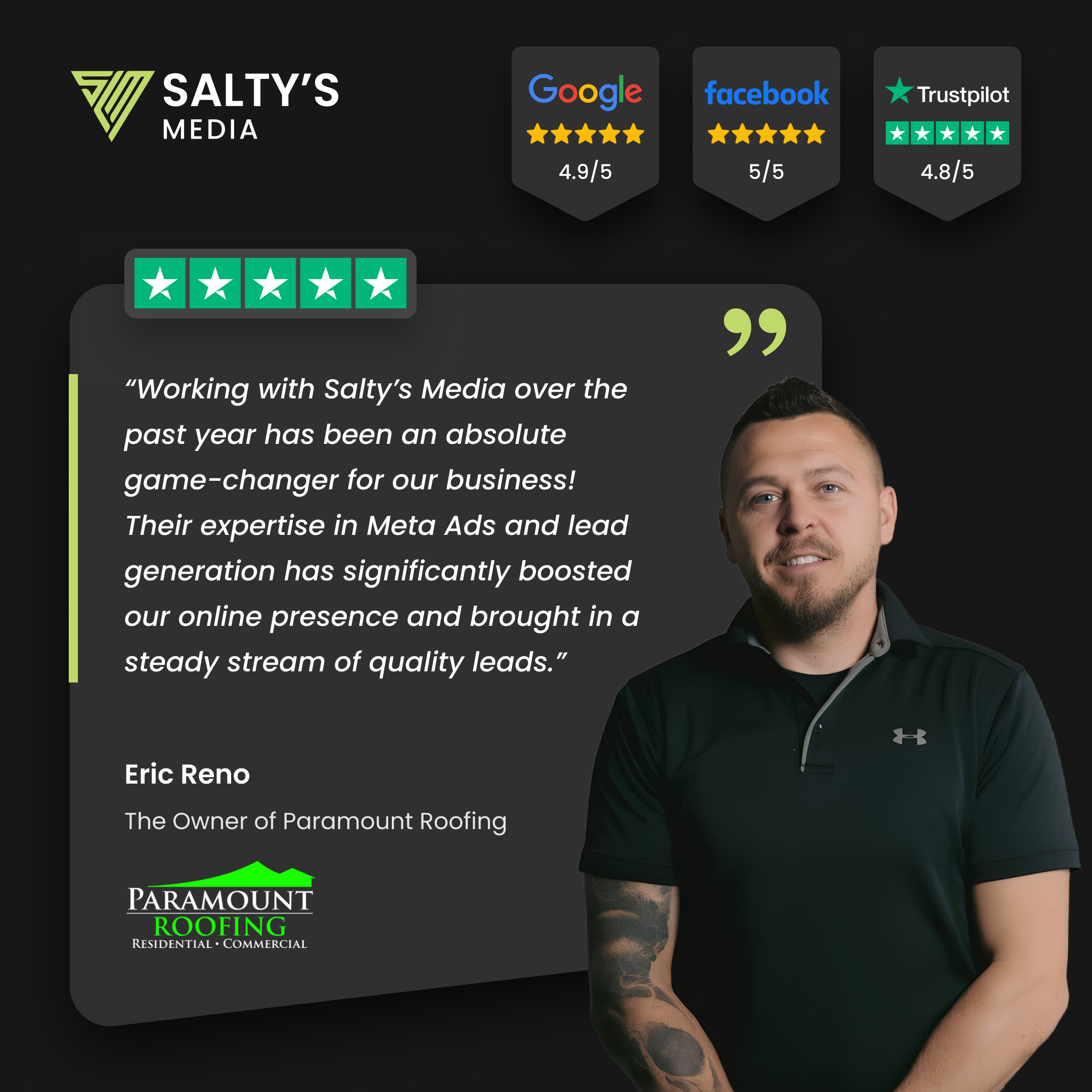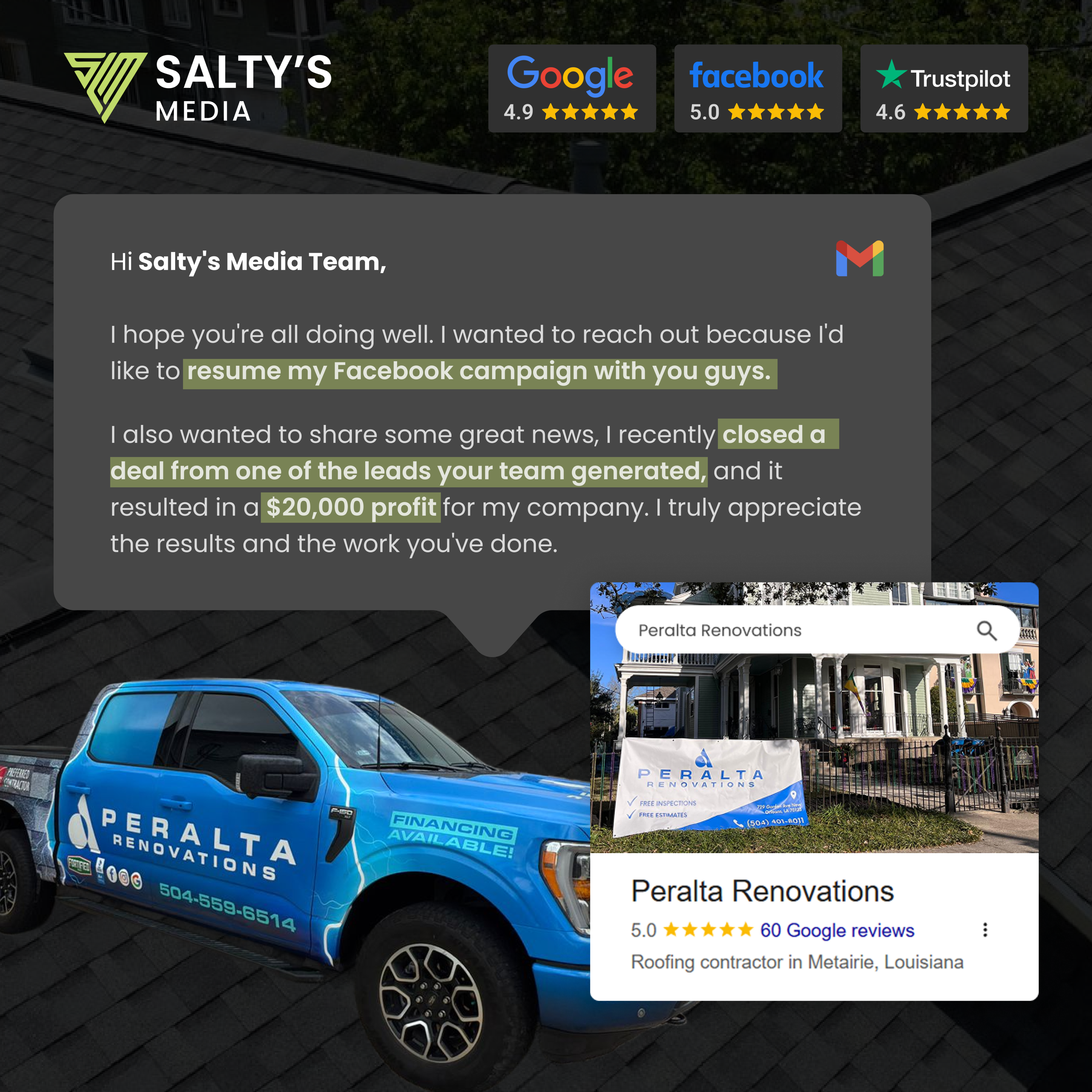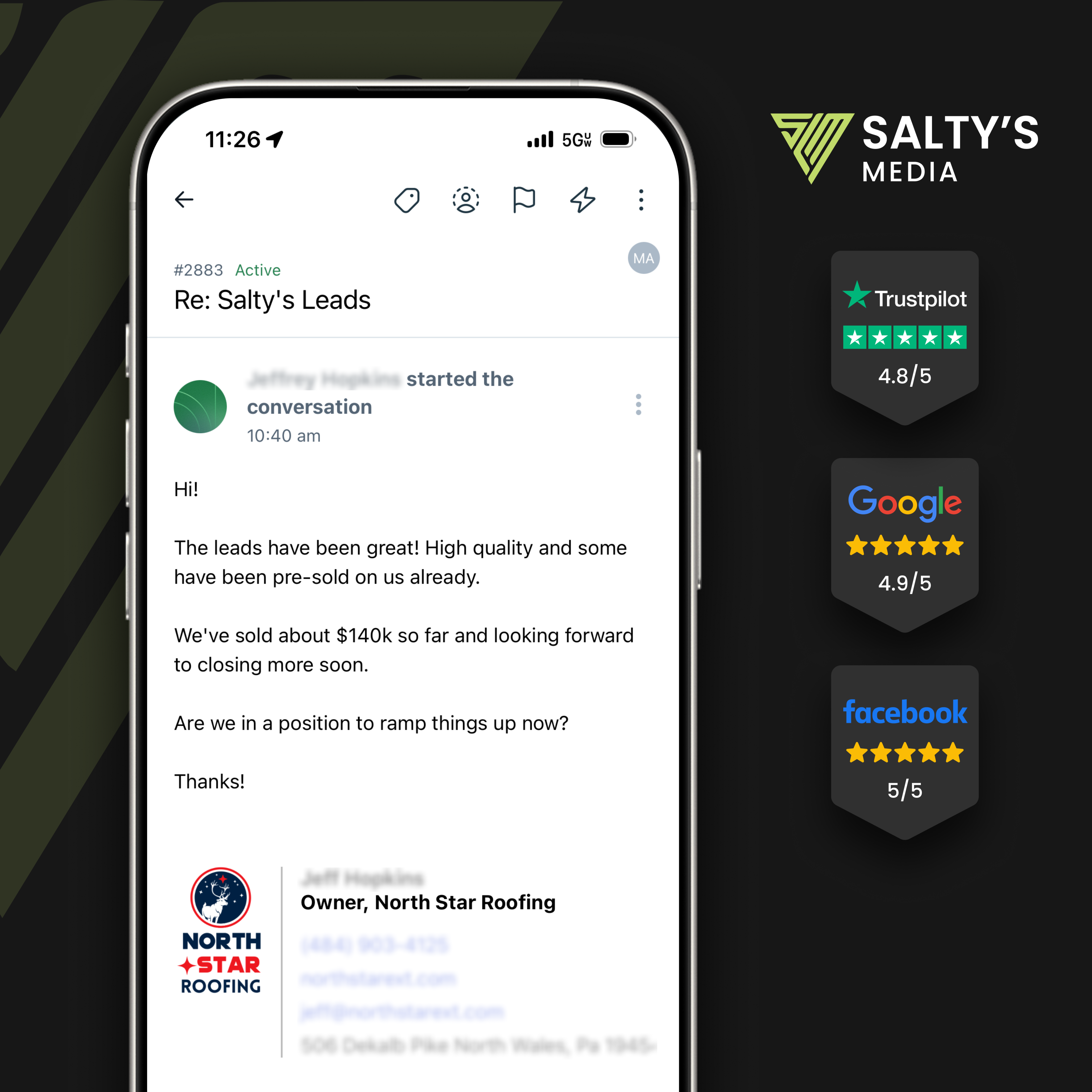 "Salty's Media has generated over 500,000 leads for my company." — Mike Feazel, Founder & CEO at Roof Maxx